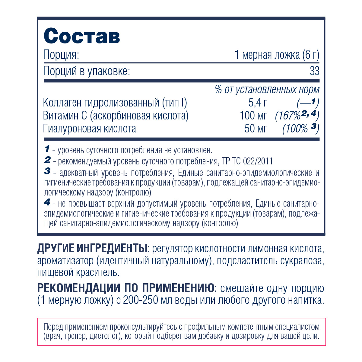 Принимая Collagen с добавлением hyaluronic acid и витамина С, мы получим более быстрое восстановление тканей суставов, соединительной ткани и кожи, в частности: