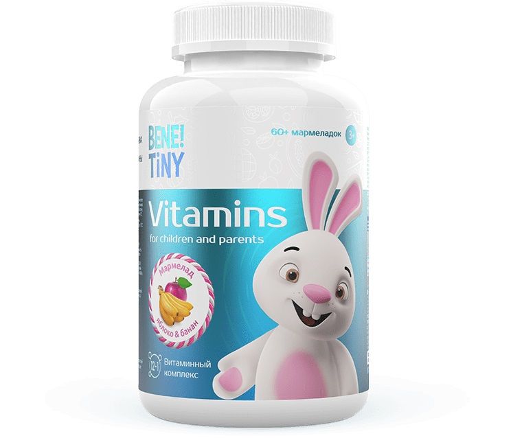 Ваш ребенок плохо кушает и недополучает витамины? Витамины для детей BENE TINY VITAMINS - это безопасные, натуральные витамины 100% органического происхождения, премиального качества, произведенные в РОССИИ. Мультивитамины для детей BENE TINY созданы на основе 13 важнейших витаминов для гармоничного развития ребёнка, имеют восхитительный вкус, легко разжевываются и обладают прекрасным сочетанием вкуса яблоко - банан. BENE TINY - это витамины для детей от 3 лет, которые будут полезны: - Для восполнения дефицита нутриентов в питании у детей - Для повышения иммунитета - При несбалансированном питании - При повышенных физических и умственных нагрузках - Для правильного роста и развития ребенка. Комплекс витаминов не содержит потенциальных аллергенов: глютена, желатина, орехов, сои, молока, консервантов.Витамины А , С, D, Е, PP, K, биотин, фолиевая кислота, витамин b12, В12, В6, Д3, детские витамины, витамины для подростков, витамин С, БАД, витамин д3 для детей. Организм ребёнка имеет интенсивный обмен веществ и особенно чувствителен к нехватке витаминов. Их отсутсвие или недостаток ведёт к нарушению метаболизма, ухудшению физической и умственной работоспособности, быстрой утомляемости и снижено успеваемости в школе. BENE TINY VITAMINS — комплекс из 13 важнейших витаминов для гармоничного развития ребёнка.