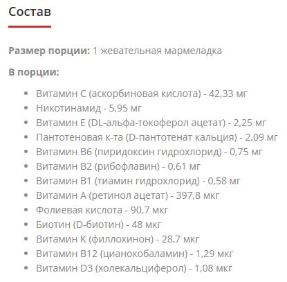 Сбалансированный состав действенных веществ легко и быстро восполнит дефицит витаминов. Это уникальное сочетание приятных, натуральных вкусов и удобной жевательной формы создаст впечатление вкусного лакомства для детей.