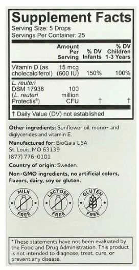 БиоГая пробиотик. Детские капли BioGaia Probiotic drops for baby содержат содержат молочнокислые бактерии Lactobacillus reuteri DSM 17938 (L. reuteri Protectis trade;).L. reuteri Protectis способствуют восстановлению микрофлоры кишечника: