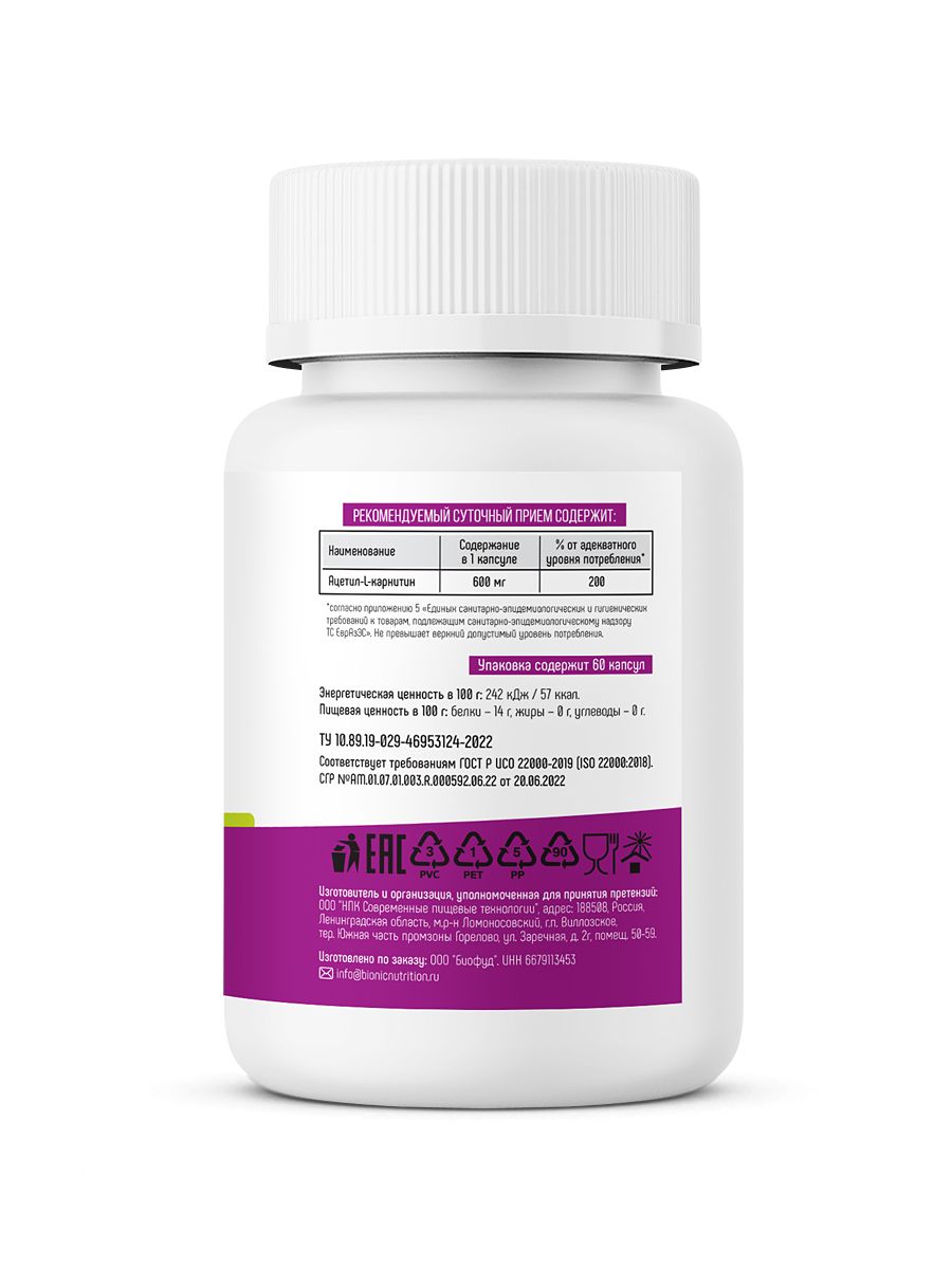 Acetyl L-карнитин от Bionic - форма аминокислоты L-карнитин с добавлением ацетильной группы для повышения биодоступности и ускоренного усвоения.