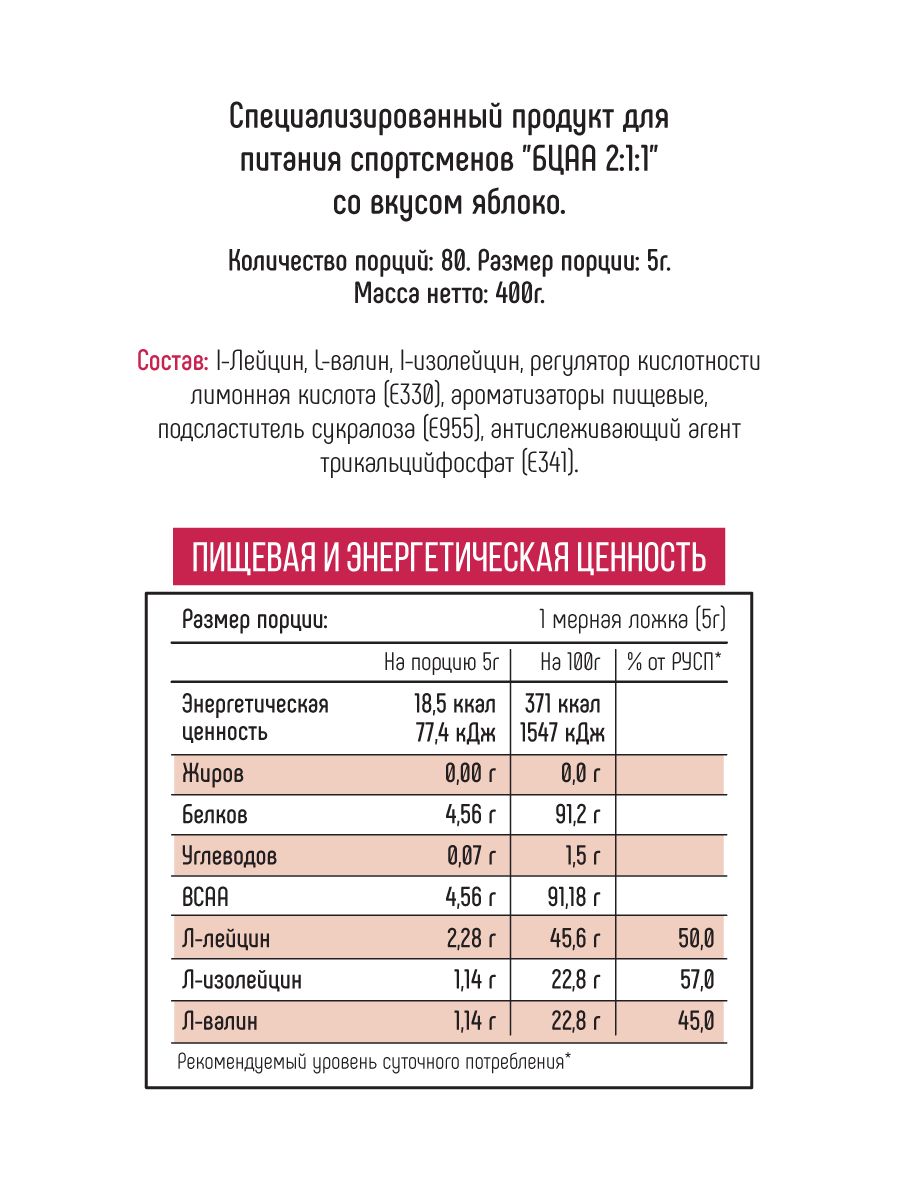 BCAA включает в свой состав три незаменимые аминокислоты: лейцин, валин и изолейцин. Эти аминокислоты составляют приблизительно 35% всех аминокислот, входящих в состав мышц, и 40% в структуре незаменимых. Около 25% энергии во время физических нагрузок выделяется из BCAA. Поскольку наш организм не способен синтезировать БЦАА самостоятельно, необходим прием БЦА в виде БАД.