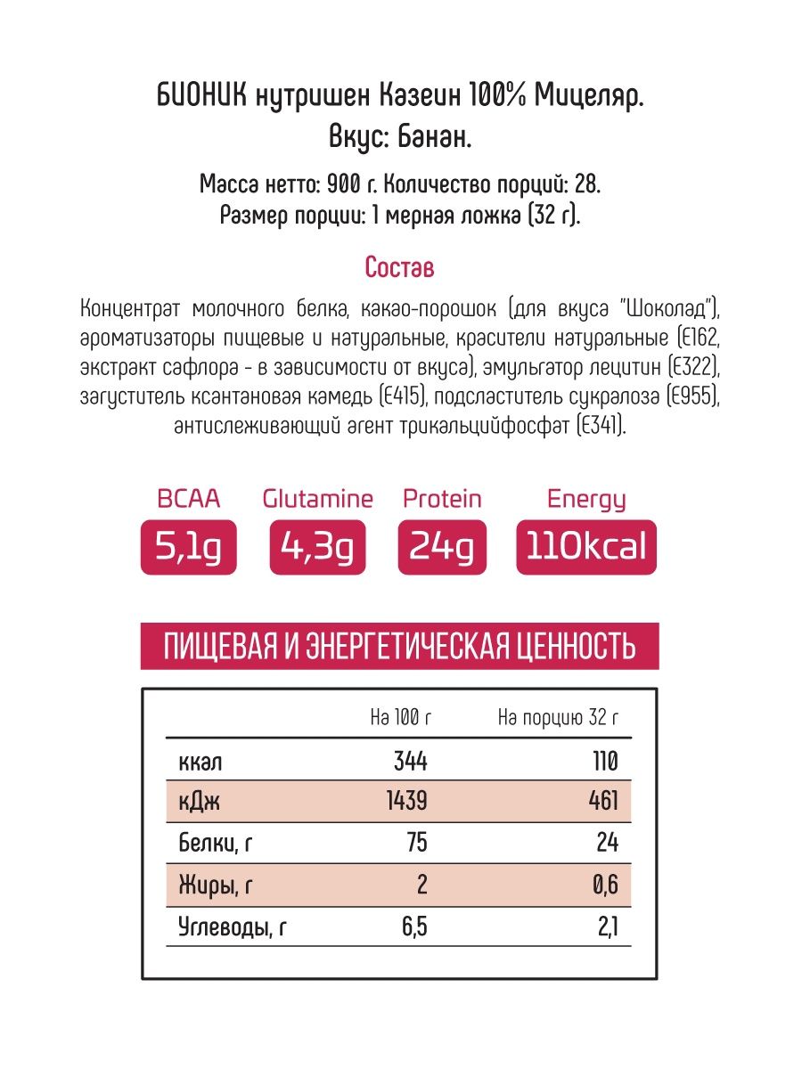 Ингредиенты: Концентрат молочного белка (80% казеиновый белок, 20% сывороточного белка), какао-порошок (для вкуса "Шоколад"), ароматизаторы пищевые и натуральные, красители натуральные, эмульгатор лецитин, загуститель ксантановая камедь, подсластитель сукралоза, антислеживающий агент трикальцийфосфат.