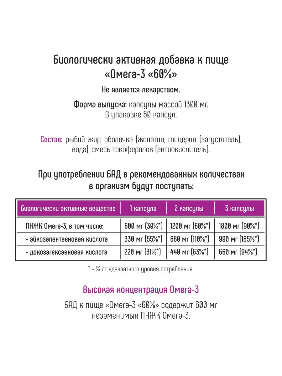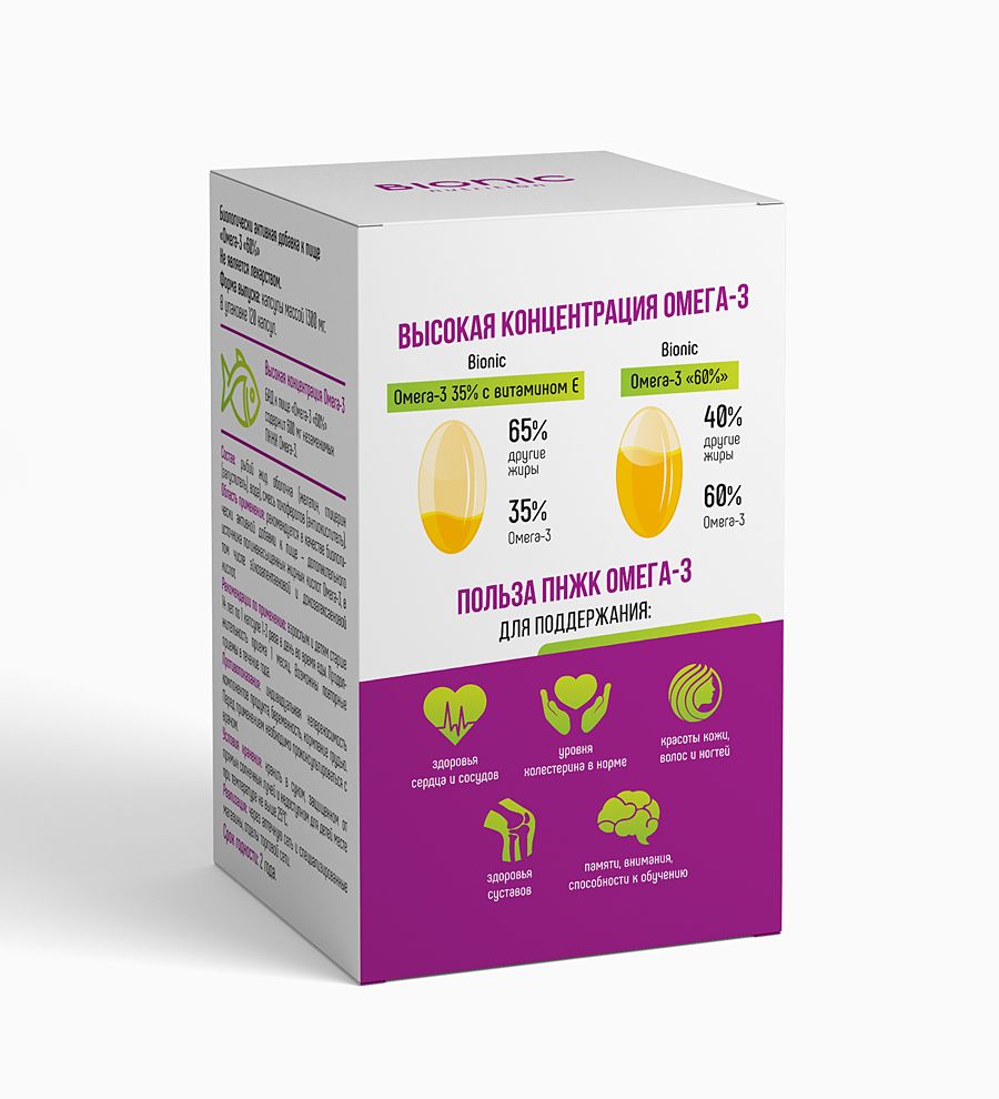 Бионик Омега 3 60% – залог здорового функционирования организма. В одной капсуле содержится двойная концентрация насыщенных и полиненасыщенных кислот, EPA (эйкозапентаеновая кислота) и DHA (докозагексаеновая кислота). Они оказывают лечащее действие на сердечно-сосудистую систему, способствуют нормализации работы организма: