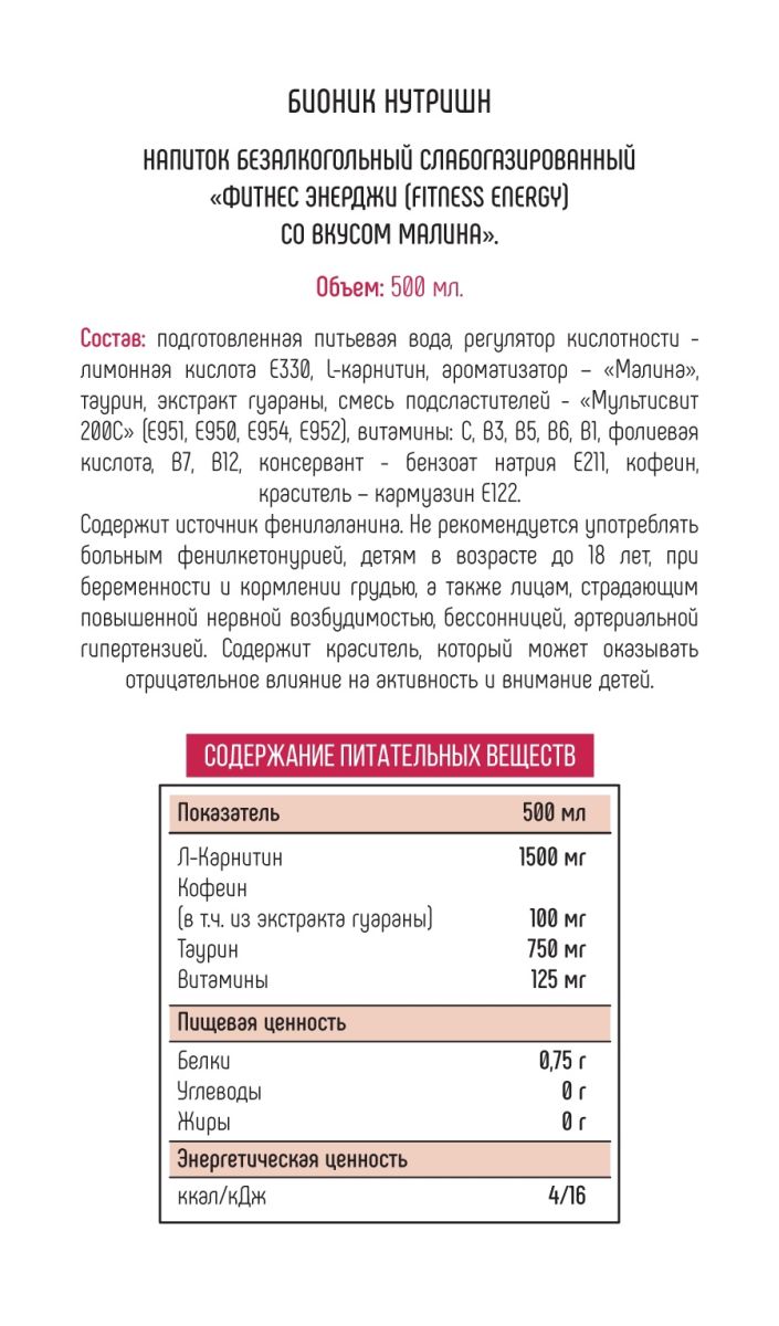 Ингредиенты: вода подготовленная, аминокислота л-карнитин, регулятор кислотности лимонная кислота, ароматизатор, консерванты (сорбат калия, бензонат натрия), аскорбиновая кислота (витамин С), подсластитель сукралоза.