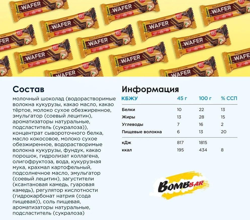 Встречайте новинку от Bombbar — вафельные батончики без сахара High Protein Waffer с высоким содержанием белка! Это невероятные низкокалорийные продукты, которые с легкостью заменят сладости, содержащие сахар, такие как конфеты, шоколадки, печенье.