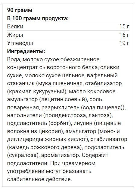 Состав: вода, молоко сухое обезжиренное, молоко сухое цельное, концентрат сывороточного белка, сливки сухие, вафельный стаканчик (мука пшеничная, стабилизатор (крахмал кукурузный), масло кокосовое, эмульгатор (лецитин соевый), соль поваренная, разрыхлитель (сода пищевая)), наполнитель (полидекстроза), какао-порошок алкализованный, наполнитель (лактоза), подсластитель (сорбит), инулин (пищевые волокна из цикория), эмульгатор (моно- и диглицериды жирных кислот), подсластитель (сукралоза).