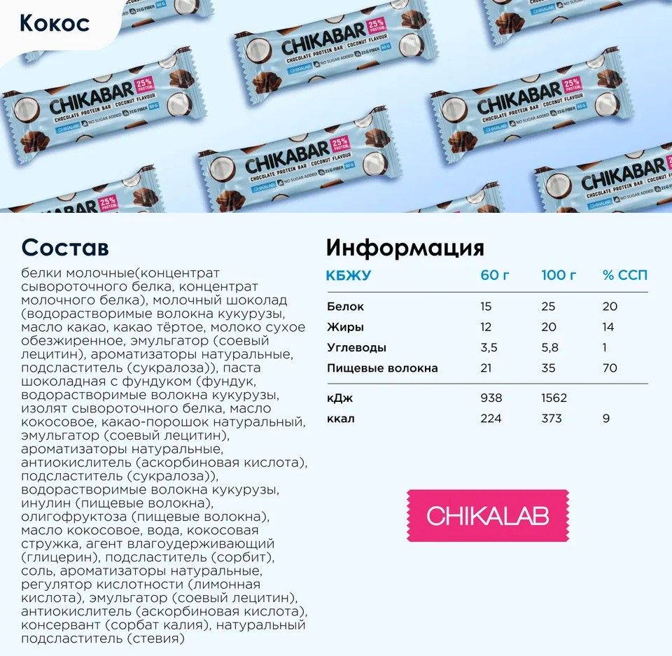 Находка для рациона любителей полезных и очень вкусных снеков - протеиновый батончик CHIKABAR. В составе высококачественный европейский белок, внутри - нежная молочная начинка, а покрыт батончик молочным шоколадом без сахара. Это не обычный шоколад, а специальная разработка CHIKALAB. При производстве и шоколада и начинки мы используем натуральные ароматизаторы и подсластители. Поэтому можно быть уверенным, что CHIKABAR это сочетание умеренной сладости, пользы и приятного вкуса в каждом батончике.