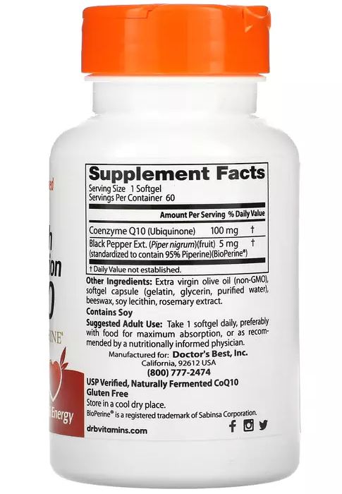 Легкоусваиваемый коэнзим Q10 от Doctor's Best содержит чистый, растительный кофермент Q10, плюс BioPerine. CoQ10 это питательное вещество, поддерживающее функцию сердца и стимулирующее выработку энергии клетками. растительный экстракт, получаемый из черного перца, способствует усвоению питательных веществ в желудочно-кишечном тракте. Предварительные исследования показали, что BioPerine повышает усвояемость CoQ10.
