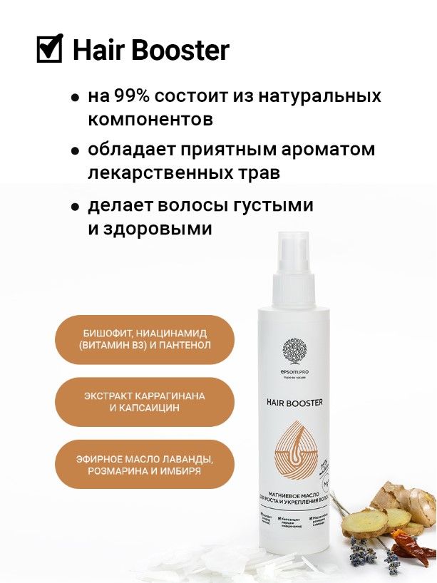 В его основе – 60% природного бишофита, который является богатейшим источником магния и более 70 полезных микроэлементов для роста и укрепления волос. Капсаицин (экстракт перца чили) и ниацинамид (витамин В3), входящие в состав, усиливают кровообращение и обменные процессы в тканях кожи головы, улучшая питание луковиц. Микс магниевого раствора с эфирными маслами укрепляет волосы, уменьшает их ломкость и жирность у корней. Масла имеют приятный и ненавязчивый аромат лекарственных трав: лаванды, розмарина, имбиря.