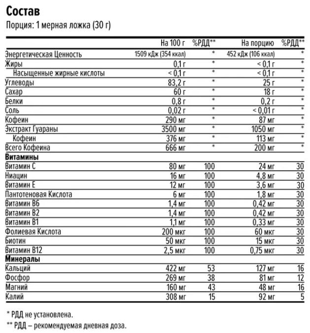 Для получения одной порции смешать 30 г порошка (1 мерную ложку) с 300 мл воды. Принимать за 30 минут до тренировки.