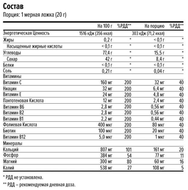 Для получения одной порции смешайте 20 г (1 мерную ложку) с 500 мл воды. Рекомендуется принимать до и во время нагрузки.