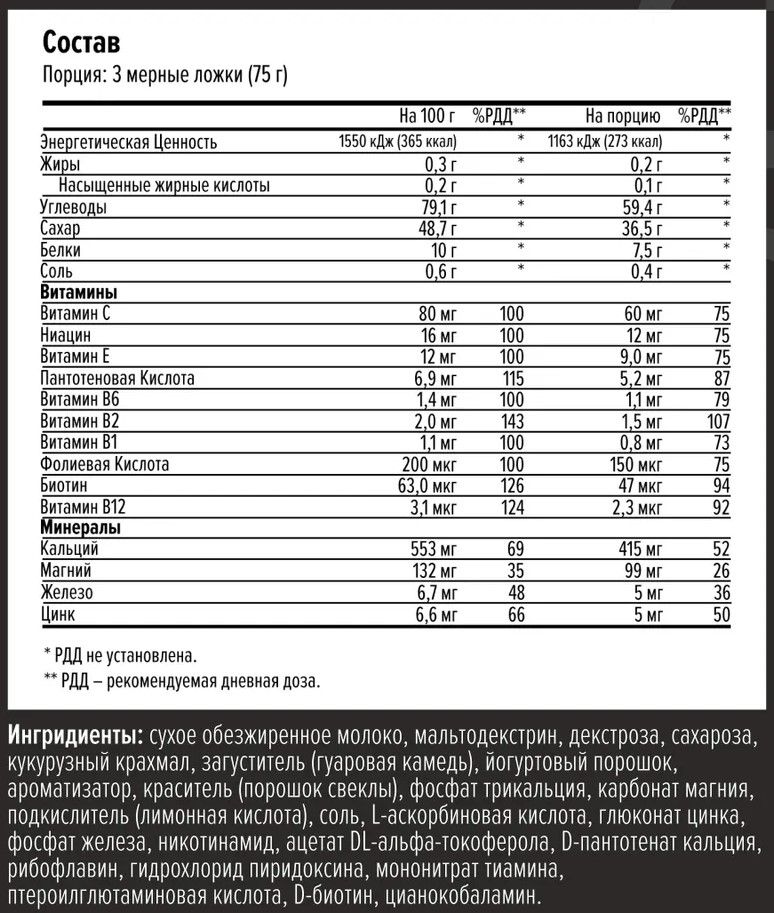 Рекомендации по применению: для получения одной порции смешайте 2 мерные ложки (75 г) порошка Mega Gainer с 500 мл молока или воды. Употребляйте 2-3 порции в день.