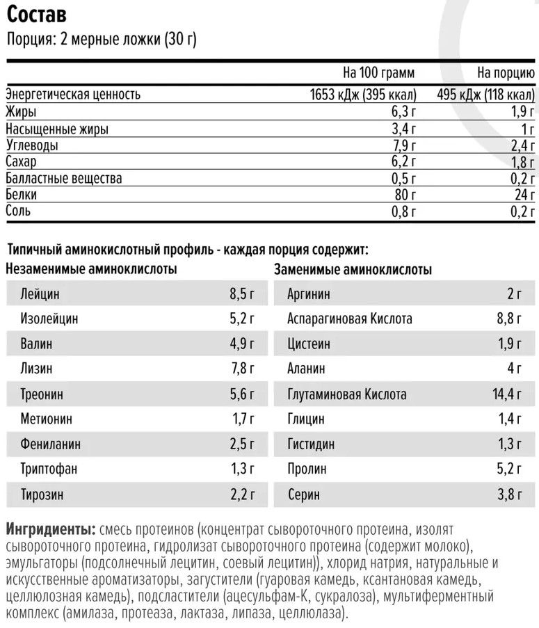 После тяжёлых физических нагрузок мышцы нуждаются в восстановлении и поддержке. Для достижения данной цели необходим белок, поскольку он выполняет функцию основных строительных блоков человеческого организма. Протеин способствует увеличению роста мышц и улучшению восстановления мышечной ткани после интенсивных тренировок. Ultra Whey – это 80%-ый сывороточный протеин высочайшего качества, который произведён из лучшего молока коров на свободном выпасе. Продукт отличается крайне низким содержанием жира и углеводов. Ultra Whey отлично смешивается, легко усваивается благодаря мультиэнзимному комплексу DigeZyme® и обладает удивительным натуральным вкусом. Ultra Whey замечательно подойдёт как для спортсменов и бодибилдеров, так и для активных людей, нуждающихся в натуральном белке высокого качества.