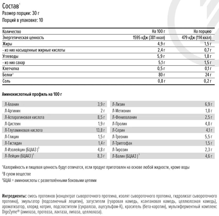 Продукт состоит из высокоочищенного концентрата, изолята и гидролизата сывороточного протеина. Ultra Whey lactose free содержит 80 г белка на 100 г. Мультиферментный комплекс DigeZyme® ускоряет и облегчает усвоение продукта.