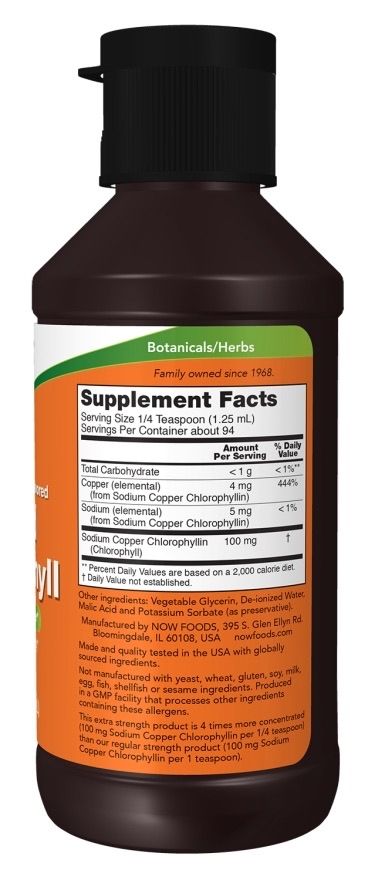 Хлорофилл является нейтрализатором свободных радикалов, может помочь поддержать процессы детоксикации организма и традиционно используется в качестве внутреннего дезодоранта. Жидкий концентрат хлорофилла от NOW представляет собой водорастворимый экстракт в форме хлорофиллина натрия и меди.