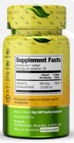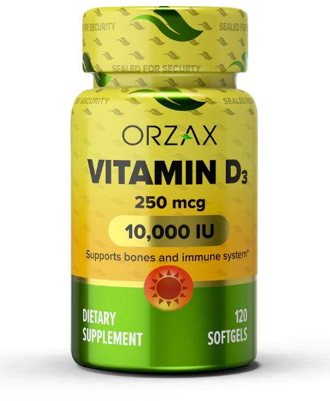 Наша формула витамина D 10000 обеспечивает высокоэффективную и биодоступную форму витамина D, помогающую организму выполнять свои функции. Дополнение Orzax Vitamin D3 250 мкг 10000 МЕ — это простой способ увеличить ежедневное потребление этого важного питательного вещества.