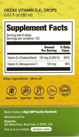 МОЩНЫЕ ИНГРЕДИЕНТЫ: капли витамина D3 K2 просты в использовании и быстро впитываются. Жидкая витаминная добавка Orzax K2 D3 содержит 5000 МЕ 125 мкг витамина D3 и 100 мкг витамина K2 (MK-7), также известного как менахинон-7, который более эффективен, чем MK-4 для организма.