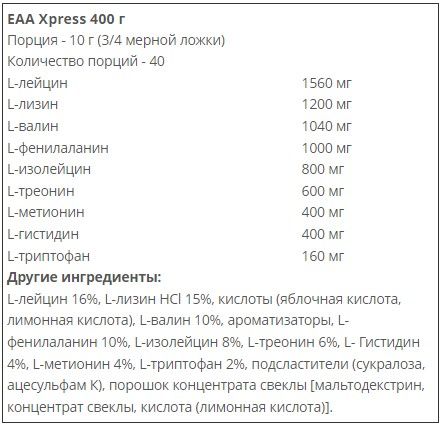 EAA Xpress содержит все незаменимые аминокислоты, необходимые для активного образа жизни, в пропорциях.
