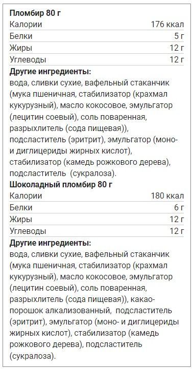 Состав: вода, сливки сухие, вафельный стаканчик (мука пшеничная, стабилизатор (крахмал кукурузный), масло кокосовое, эмульгатор (лецитин соевый), соль поваренная, разрыхлитель (сода пищевая)), какао-порошок алкализованный, подсластитель (эритрит), эмульгатор (моно- и диглицериды жирных кислот), стабилизатор (камедь рожкового дерева), подсластитель (сукралоза). Содержит подсластители. При чрезмерном употреблении могут оказывать слабительное действие. Может содержать незначительное количество арахиса, миндаля и грецкого ореха.