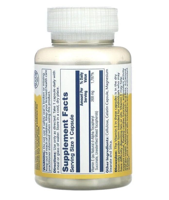 Solaray Витамин Е представляет собой жирорастворимую, биодоступную мягкую таблетку для яркого и сияющего здоровья! Мощная антиоксидантная активность витамина Е, разработанная для поддержки здоровой сердечно-сосудистой функции и более мягкой и сияющей кожи, может защитить организм от повреждения свободными радикалами, чтобы вы чувствовали себя лучше. Наш витамин Е, 100% натуральный, создан на основе смешанных токоферолов d-бета, d-гамма и d-дельта для еще большей антиоксидантной поддержки. И это Solaray, так что вы знаете, что его чистота, эффективность и качество были проверены в лаборатории и созданы, чтобы помочь вам жить ярче!