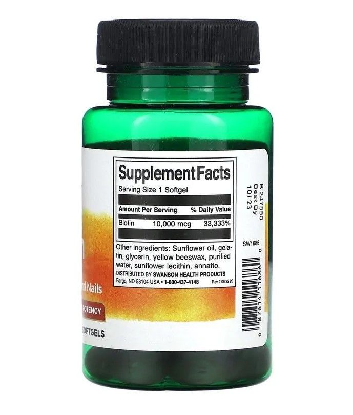Swanson Biotin 10000 мкг, 60 гел., капс. — это высококонцентрированная добавка биотина в удобных капсулах, предназначенная для поддержки здоровья волос, кожи и ногтей. Биотин, также известный как витамин B7, играет ключевую роль в метаболизме углеводов, жиров и белков, а также в поддержании нормального состояния кожи и волос.