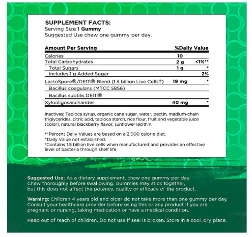Состав (на порцию 1 жевательная таблетка): Калории - 10, Всего углеводов - 2 гр, Всего сахара - 1 гр, Содержит 1 гр добавленного сахара, Смесь LactoSpore/DE111® (1,5 млрд живых клеток †) - 19 мг, Bacillus coagulans (MTCC 5856), Сенная палочка (Bacillus subtilis DE111®), Xylooligosaccharides - 40 мг