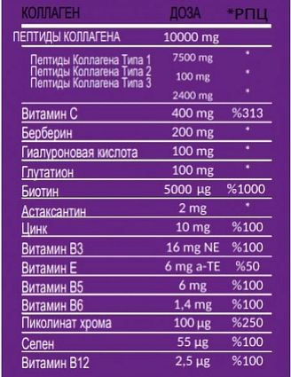 гидролизованный коллаген, витамин с, берберин, гиалуроновая кислота, глутатион, пиколинат хрома, астаксантин, пиколинат цинка, витамин b3, витамин е, витамин b6, витамин b5, селен, витамин b12