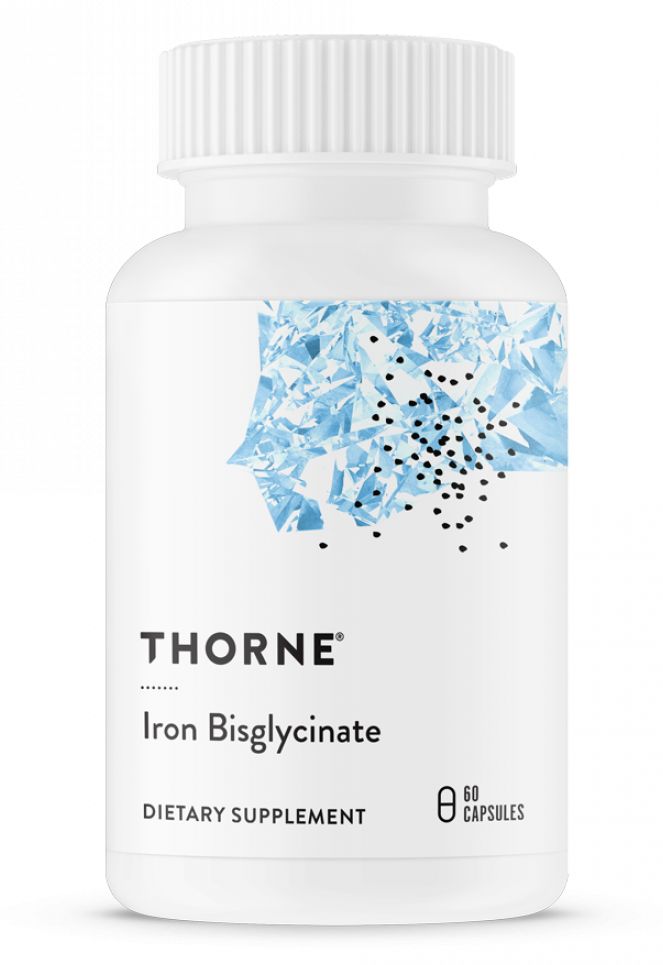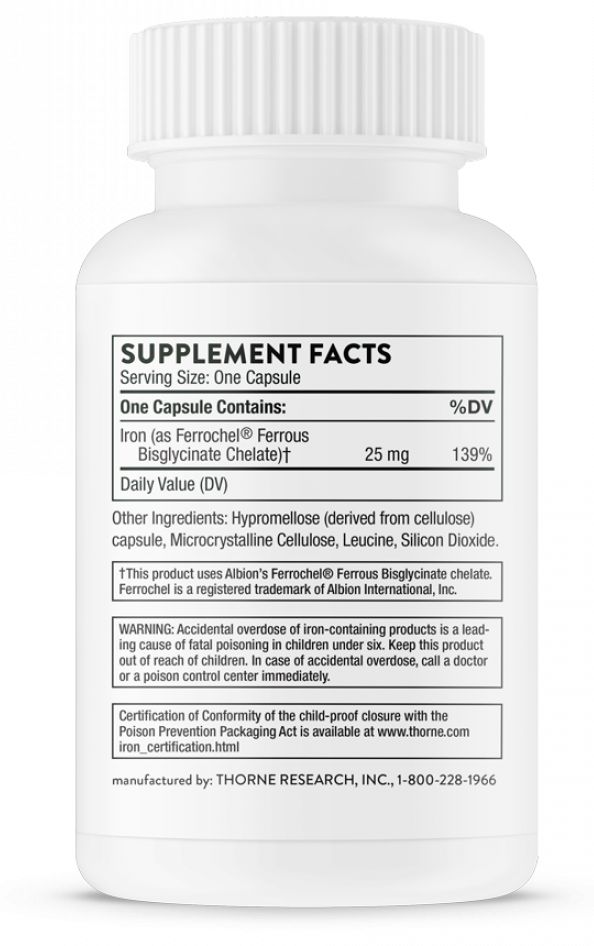 Дефицит железа может выражаться в слабости, утомляемости, одышке, головокружении, шуме в ушах, пятнах перед глазами, сонливости, раздражительности, сбое менструального цикла, утрате полового влечения. При интенсивных физических нагрузках требуется примерно в 1,5 раза больше железа, чем в другой ситуации. Тем, кто придерживается вегетарианской или низкобелковой диеты, может потребоваться в 1,8 раза больше железа, поступающего с пищей. Потеря крови из-за травм и повреждения мышц, а также из-за желудочно-кишечных кровотечений, связанных с повышенной выносливостью, может еще больше уменьшить запасы железа в организме. Обычные добавки с железом, включая такие формы, как сульфат железа, могут вызывать побочные желудочно-кишечные эффекты, включающие тошноту, рвоту, запор, диарею и стул темного цвета, поскольку эти обычные формы железа плохо усваиваются организмом. Биcглицинат железа Thorne содержит в одной капсуле 25 мг элементарного железа в соединении с глицином для оптимального всасывания в желудочно-кишечном тракте, что помогает уменьшить типичные желудочно-кишечные побочные эффекты.